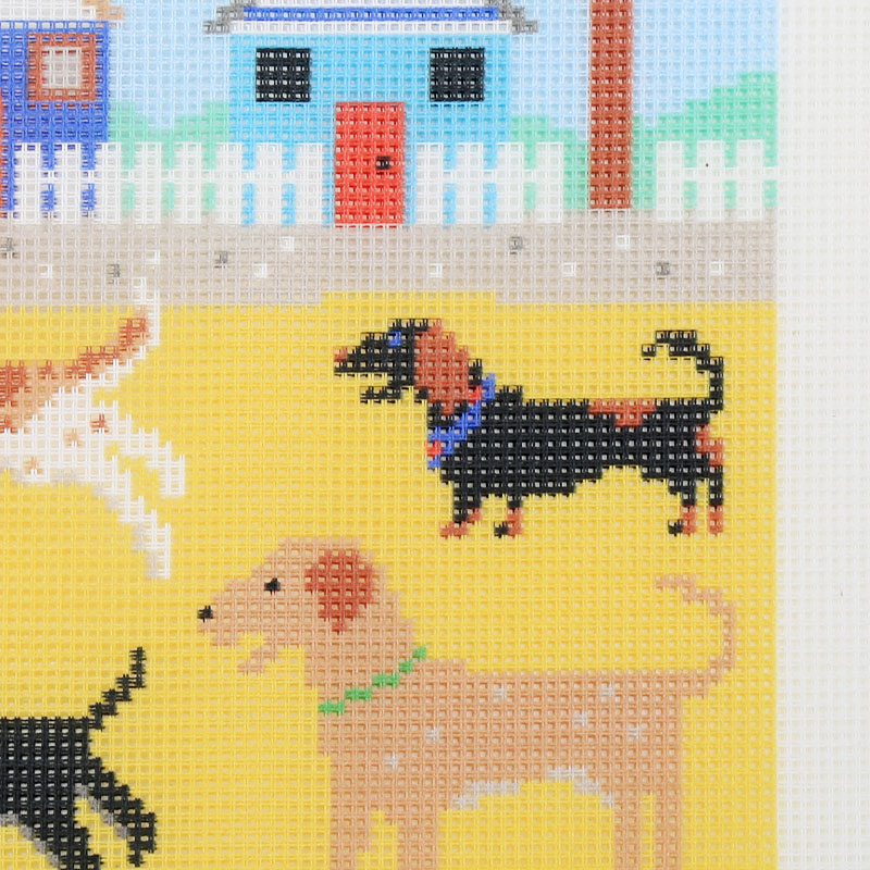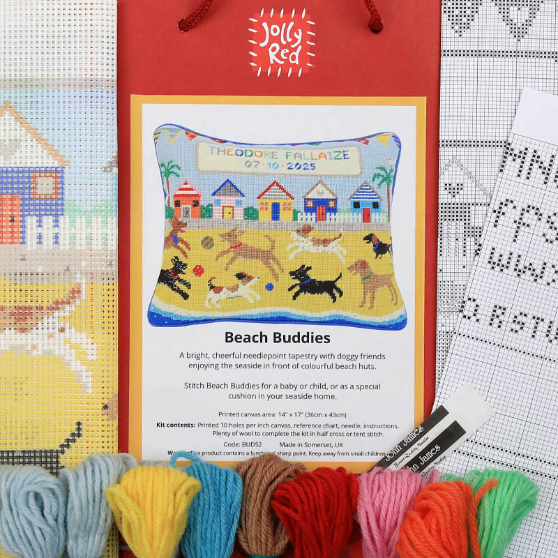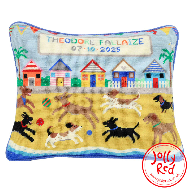 Beach Buddies tapestry kit is wonderful tapestry to stitch for someone in a dog-loving family, or for a seaside home. A playful pack of dogs are chasing balls on the sand in front of a row of colourful beach huts. Waves are lapping against the sand. The bunting is out; it’s a sun-filled day at the seaside.