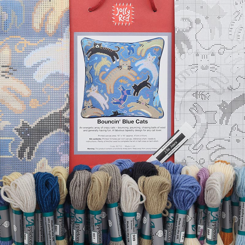 Bouncin’ Blue Cats is a fun and exuberant tapestry kit for cat lovers, with feline friends at play. Bouncin’ Blue Cats features sixteen energetic pusses jumping around and chasing balls of wool.