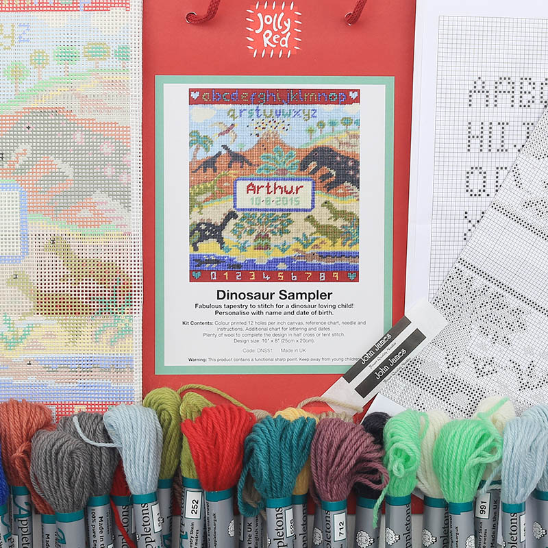 Jolly Red’s Dinosaur Sampler is a prehistoric themed tapestry kit to delight any young palaeontologist. Dinosaurs feed and roam, with a dramatic erupting volcano in the background.