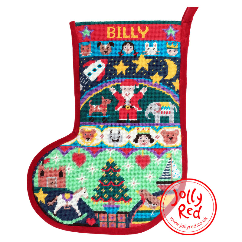 Festive Fairytale is a stunning Christmas stocking tapestry kit in our traditional boot-shaped range of kits. Festive Fairytale features a joyful Santa with lots of traditional children's toys, a decorated Christmas tree, and a little robin observing the festivities. A rocket blasts off into a starry sky above.