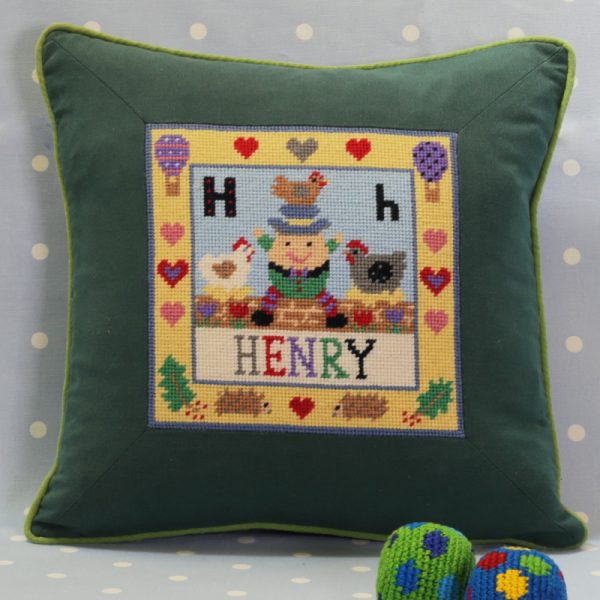 H for Humpty A-Z Animals tapestry is a lovely needlepoint to stitch for a baby or young child. Humpty Dumpty is on his wall, with helpful hens on either side reminding him to not fall off. In the borders there are hearts, hedgehogs and hot air balloons.