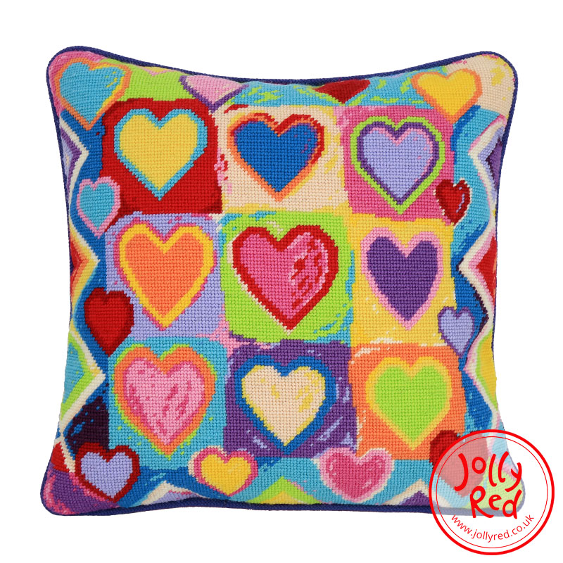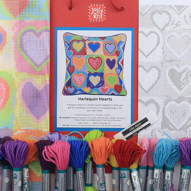 Harlequin Hearts is a vibrant, dark-days defying tapestry kit to brighten up your winter days and evenings. The design is a patchwork of multi-coloured hearts, with a patterned diamonds border. Harlequin Hearts has been adapted from an oil pastel drawing by Kelly, hence the lovely bright colours. They translate perfectly into Appletons tapestry wool.