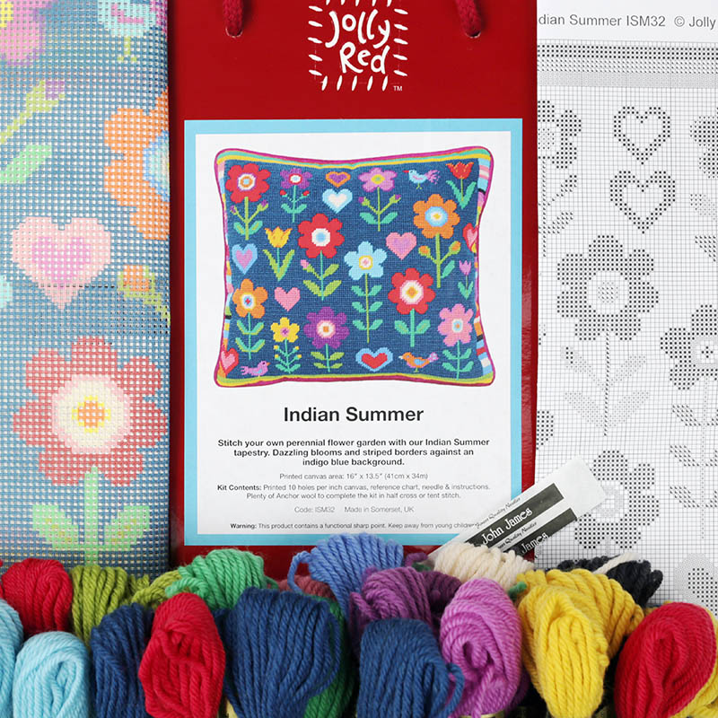Stitch our stunning Indian Summer tapestry kit for a guaranteed display of vibrant flowers all year round. With colourful blooms and striped borders against an indigo blue background, Indian Summer is a joy to stitch.