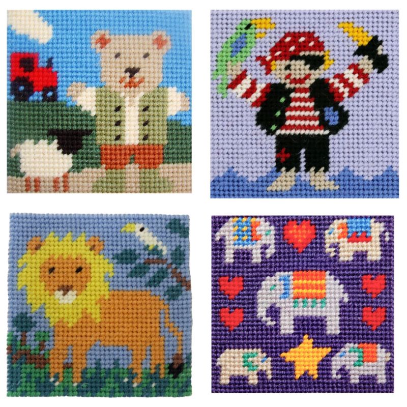 A collection of four exciting colour printed tapestry canvases. The designs are Farmer Bear, Pirate, Lion, and Little Elephants. The canvases are perfect for stitch parties, family get-togethers, and quiet times on holiday.