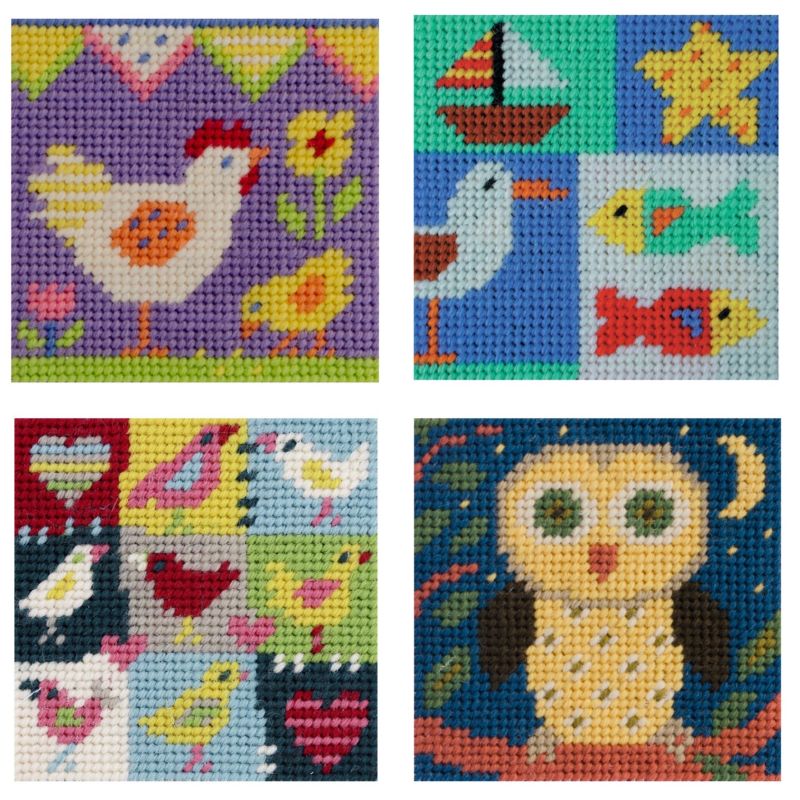 A collection of four colour printed tapestry canvases with a birds theme. The designs are Mother Hen, Seaside, Birds of a Feather, and Little Owl. The canvases are perfect for stitch parties, family get-togethers, and quiet times on holiday.