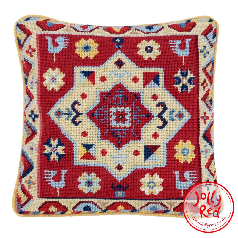 Peacock Star is a striking needlepoint design with a central star and stylised peacocks and flowers. In shades of reds, blues and oatmeal Peacock Star is a wonderful feature tapestry for a favourite chair or sofa.