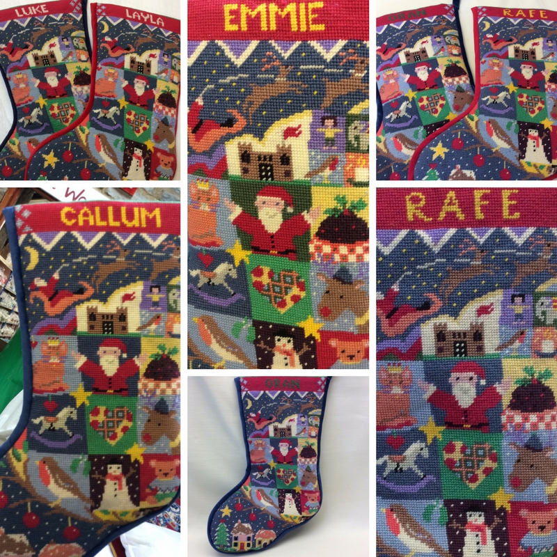 It’s time for the annual celebration of the Jolly Red Christmas stockings that have been sent in to our Somerset workshop for our making up service. This year we’ve assembled albums of finished stockings so that you can see them here on our blog. We hope that seeing them together will help you to decide which one you’d like to stitch next, or which design to choose if you’re contemplating making your first stocking.