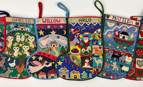 Christmas Stockings – £85.00 Includes stretching of your stocking, backing fabric and bound edge (same fabric) and hanging loop. Contrast lining fabric and wadding between the layers. Click here for a bit of help with choosing fabric for your Christmas stocking.